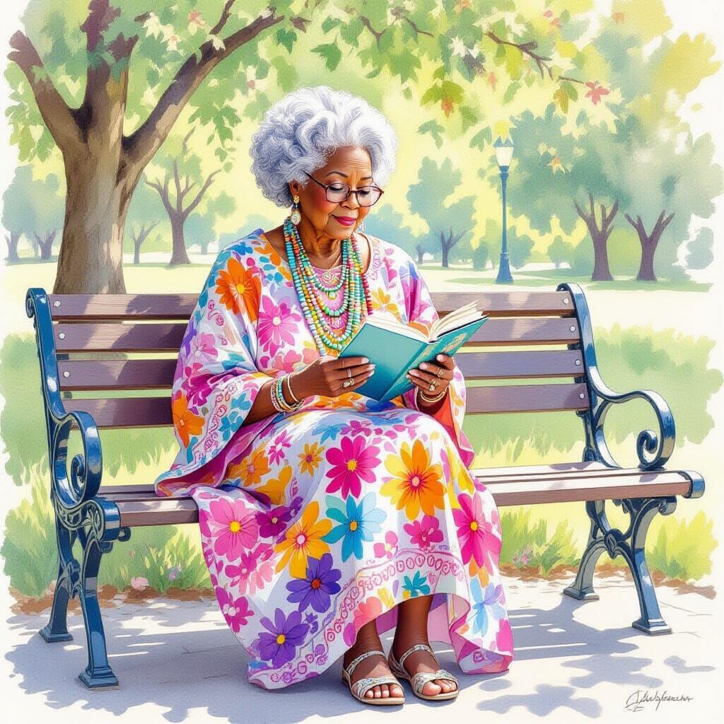 A serene image of an elderly African-American woman reading in the park. She is wearing a colorful dress and has flowers in her silver hair, rendered in a soft watercolor style.