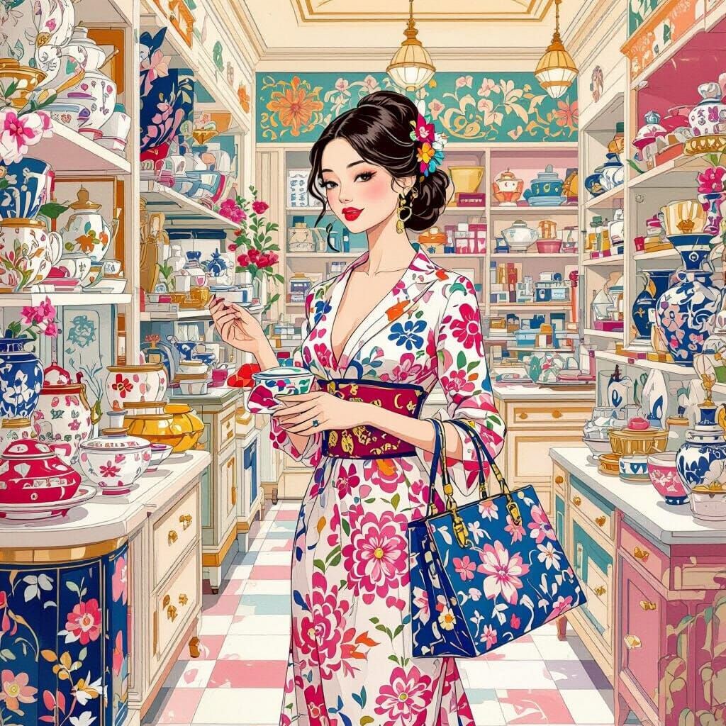 A vibrant image of a stylish woman shopping for home goods. The scene features luxurious decor and furnishings rendered with intricate patterns and a colorful, contemporary pop art aesthetic.