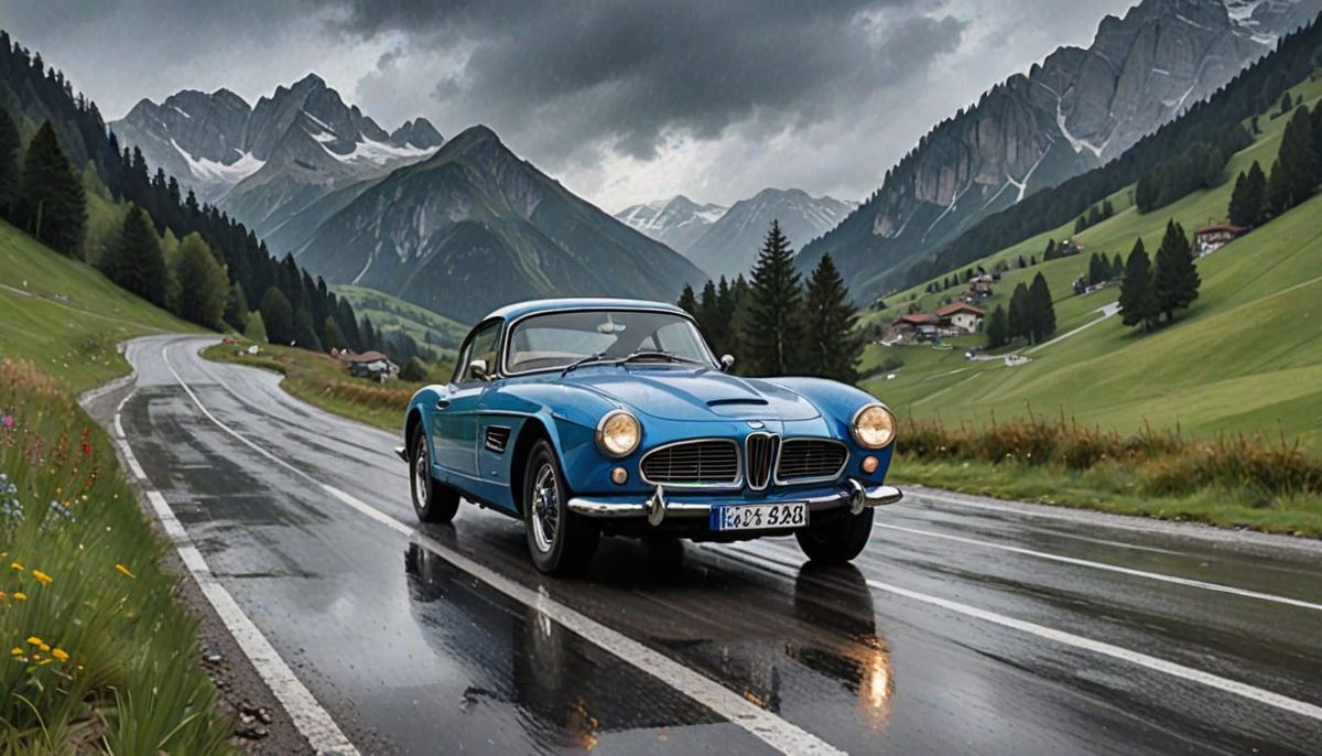 This image shows a beautifully restored 1957 BMW 507 coupe speeding along a winding mountain road in the rain. The car features custom wheels and a wide body, rendered as an expressionist impasto painting.