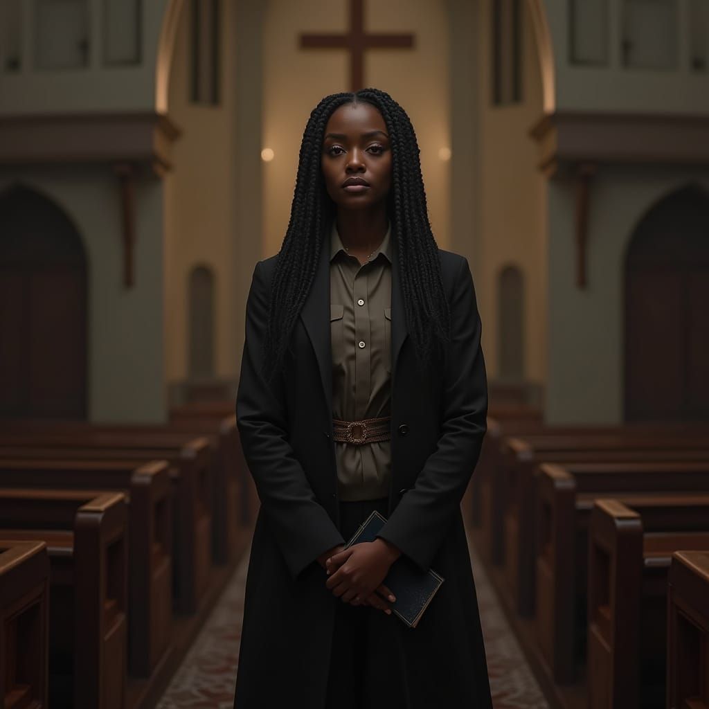 This image shows a young African American woman holding a bible in a derelict church. The hyperrealistic digital artwork features moody lighting and realistic textures.