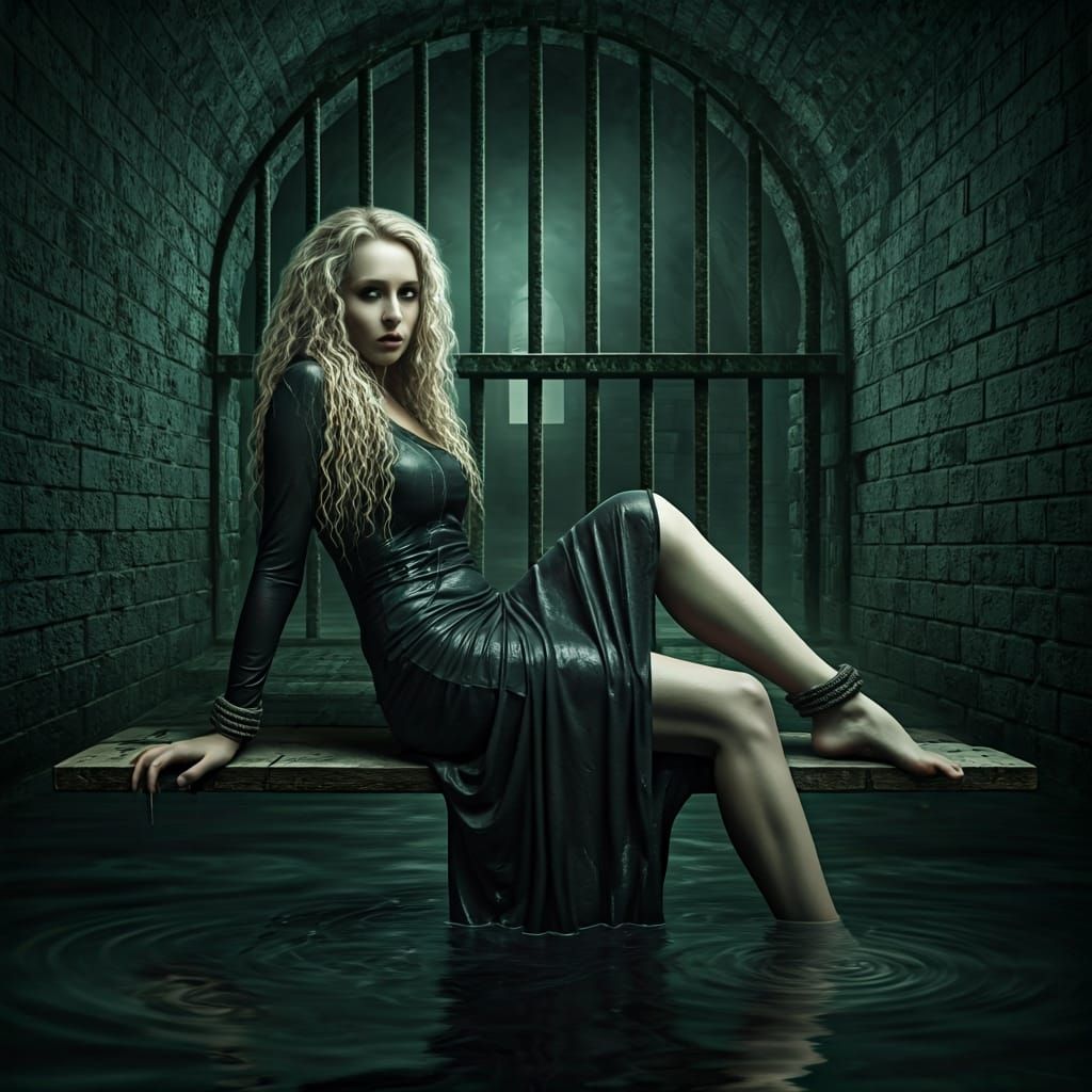 A haunting image of a blonde woman in a black dress sitting in a flooded medieval prison. The eerie atmosphere is enhanced by dark colors and ominous shadows, reminiscent of dark surrealist art.