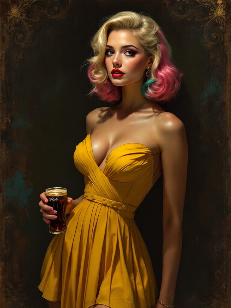 This image features a full-body pin-up woman with blond hair tipped pink and teal, wearing a yellow pleated dress. It blends baroque lighting with vintage commercial art aesthetics.