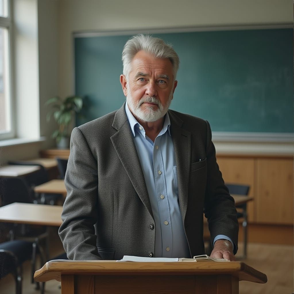 This image shows a distinguished older man with silver hair and blue eyes. He is wearing a tweed suit and standing at a lectern in a classroom, rendered with hyperrealistic detail.