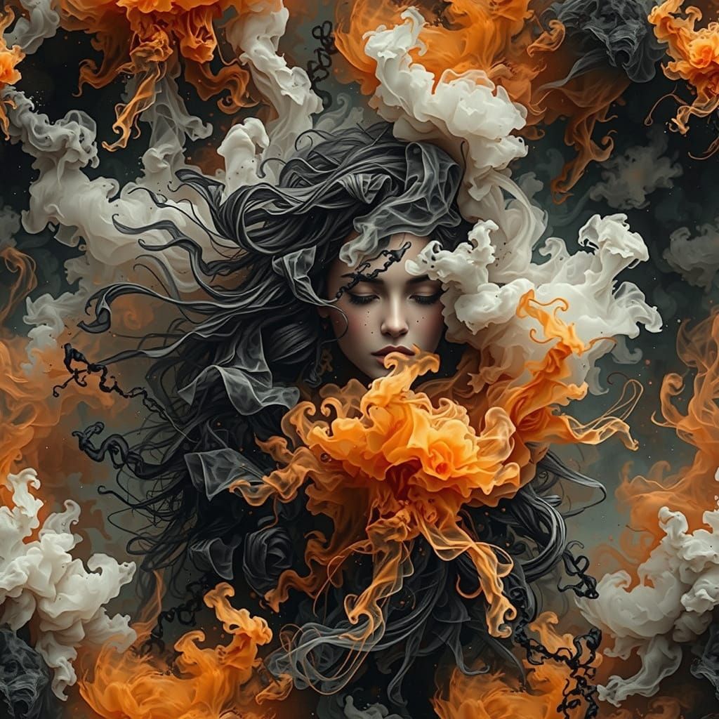 This image shows a breathtaking digital art piece featuring delicate, intricate details and a high-contrast color palette. The ethereal orange smoke dissolves into a mysterious big smoke cloud, capturing the essence of a golden hour atmosphere.