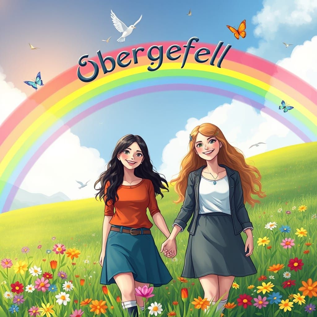 This image shows two women holding hands in a flower-filled meadow beneath a vibrant rainbow. The artwork blends luminous and enchanting elements to create a romantic, dreamlike atmosphere.