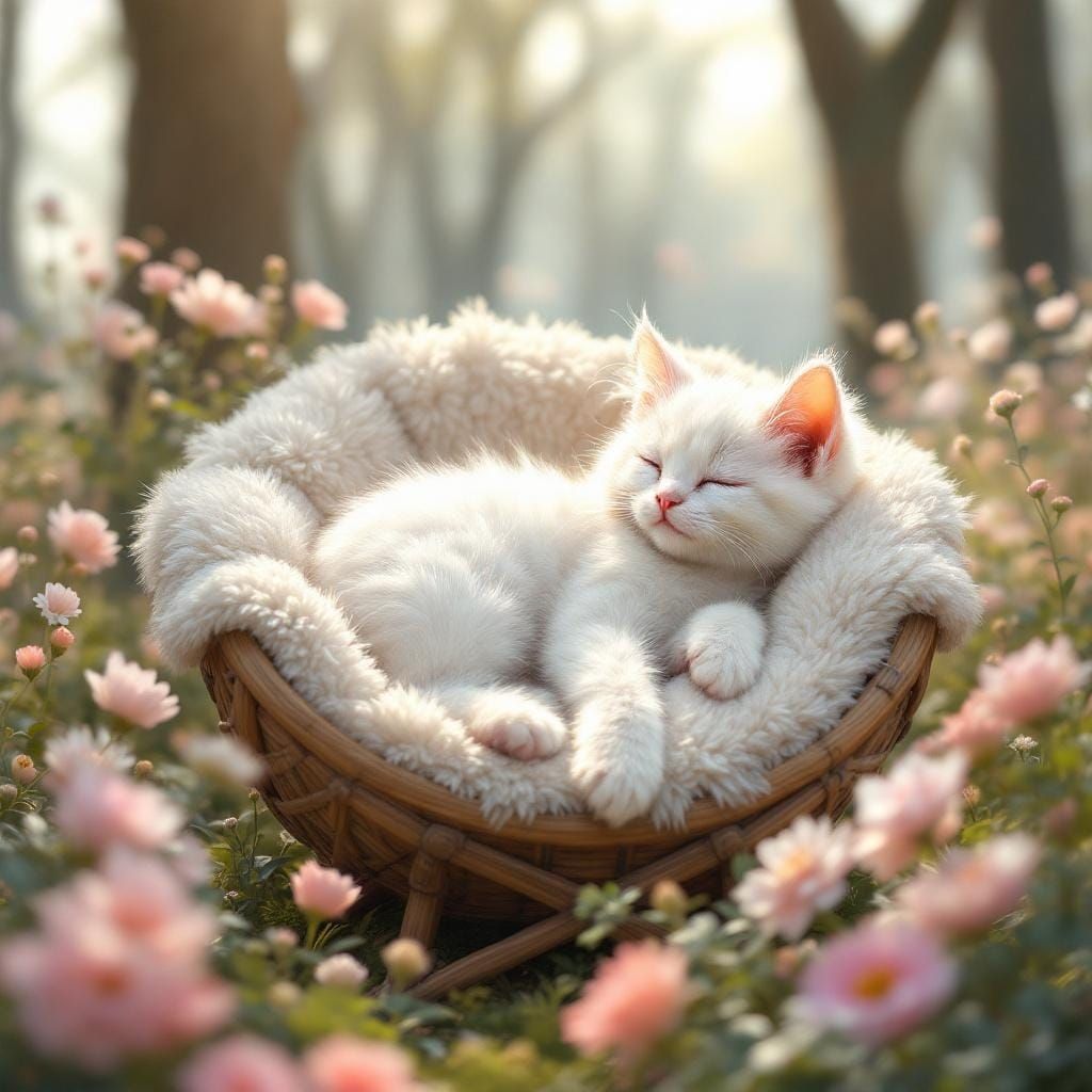 This image shows a white cat sleeping peacefully on a fluffy armchair. The scene is set in an enchanted forest filled with pastel flowers, rendered in a soft, photorealistic 3D style with cinematic lighting.