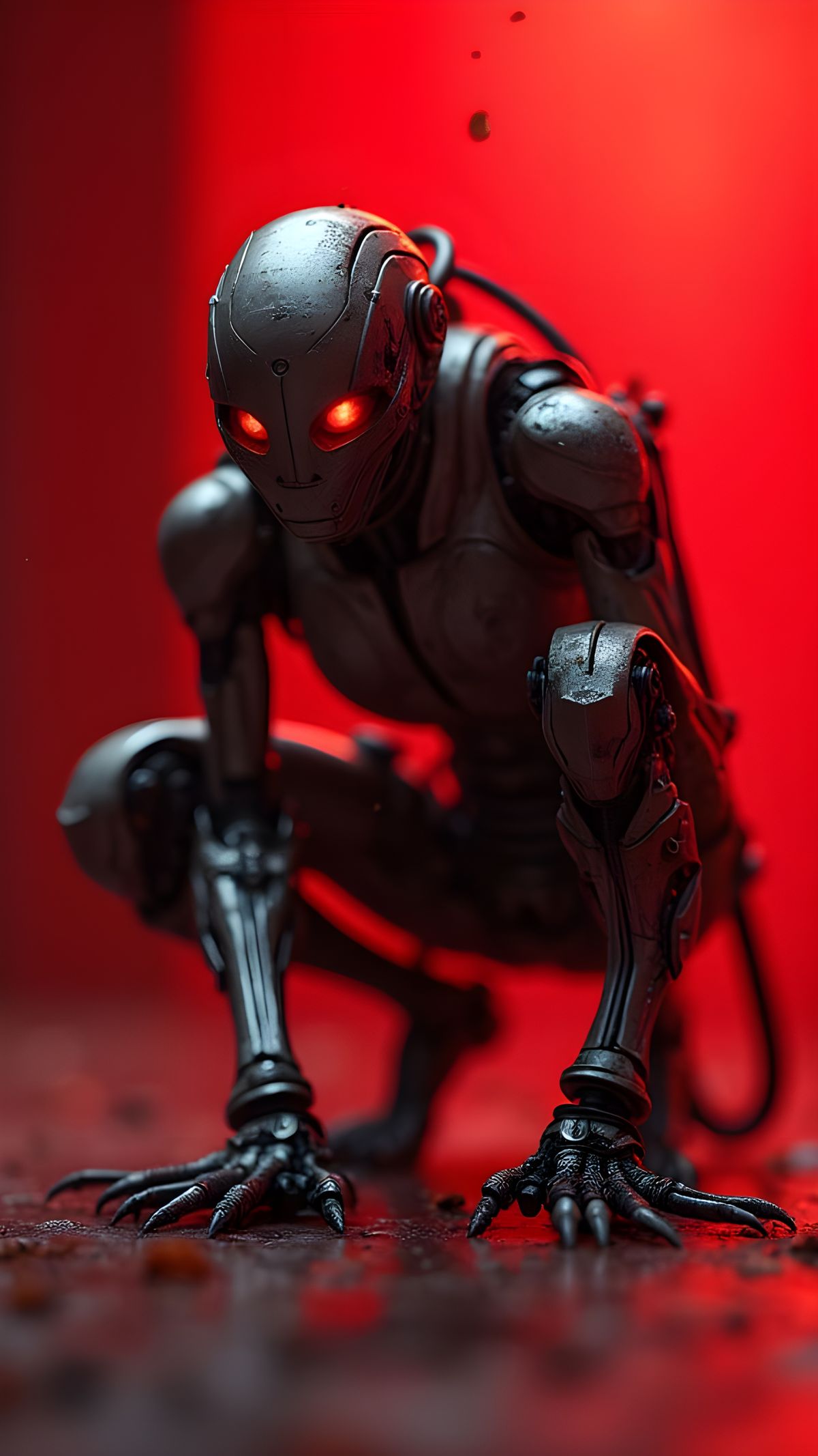 This image shows a biomechanical creature with human and machine elements, crouching in a red void. Cinematic lighting and a tilt-shift effect highlight its detailed metallic form and glowing eyes.
