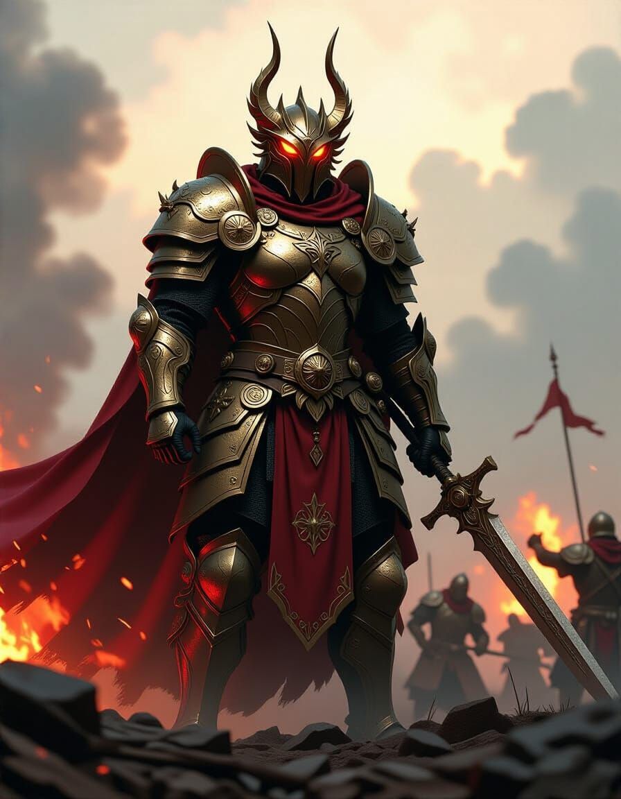 A striking picture of a golden dragon paladin radiating hope on a desolate battlefield. This hyperdetailed digital painting showcases the dragon's gleaming scales, burning eyes, and armor symbols of courage.