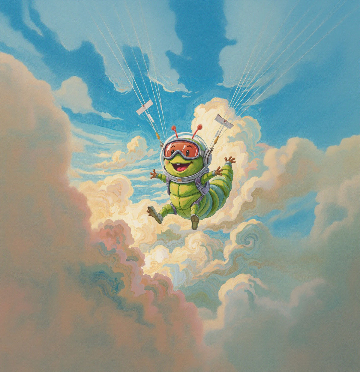 This image shows an excited caterpillar skydiving through a bright blue sky. The vibrant colors and whimsical subject create a joyful and adventurous scene.
