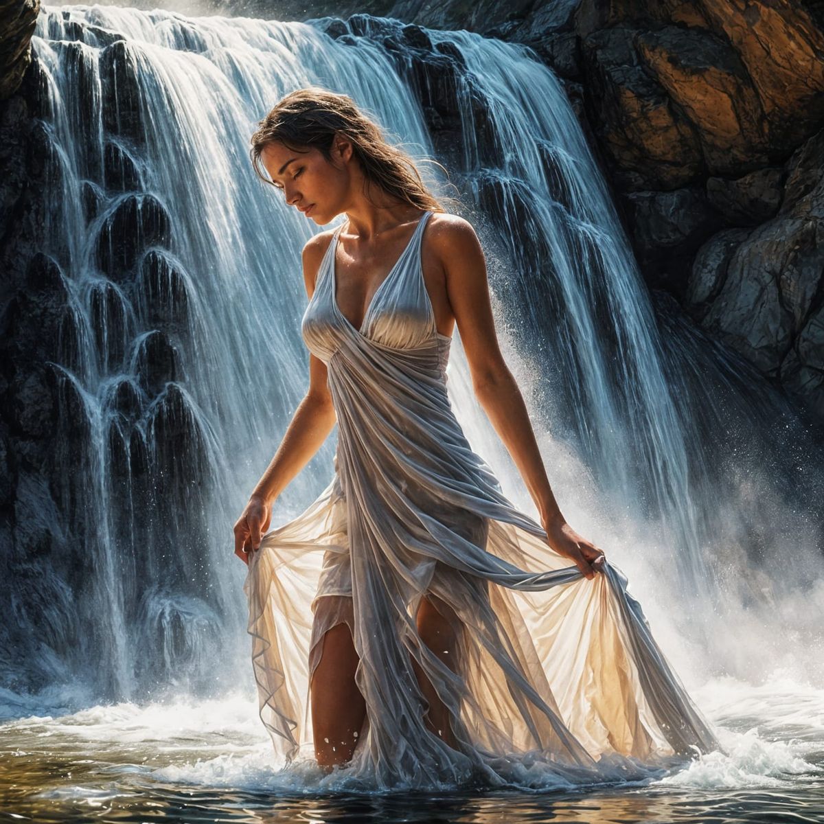 This image shows a woman standing beneath a powerful waterfall. The digital painting captures the play of light on wet fabric and glistening skin, with dynamic brushstrokes and an emphasis on light and shadow.
