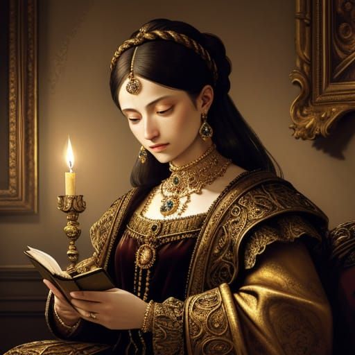 This image shows a woman in ornate Baroque attire holding a book. The artwork is reminiscent of Rembrandt, with golden light illuminating jewels and intricate velvet textures in a chiaroscuro style.