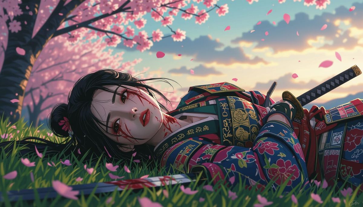 This image shows a wounded samurai lying on the ground, gazing upwards. Her vibrant samurai attire contrasts with her injuries and the broken katana beside her, set against a background of cherry blossoms as digital art.