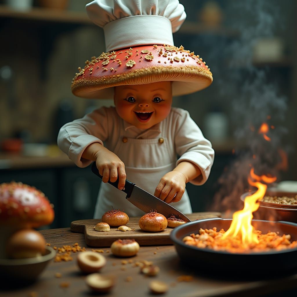 This cinematic image depicts a humanoid mushroom chef, slicing and sautรฉing mini mushrooms with precision, set against a warm, film-like backdrop with subtle grain and vignette, evoking an epic, atmospheric feel.