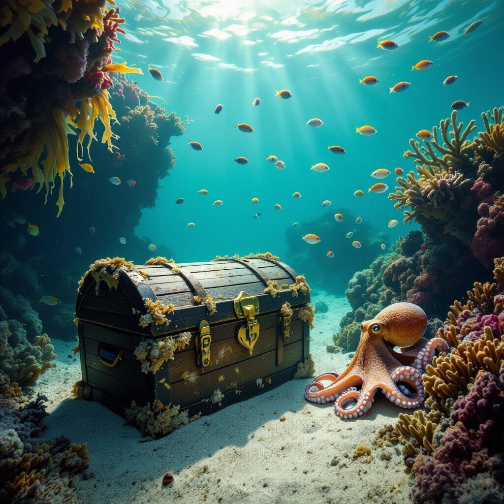 This image shows an old wooden chest covered in barnacles, sitting on the ocean floor. Schools of fish swim nearby as an octopus watches from the coral in this hyperrealistic rendering.