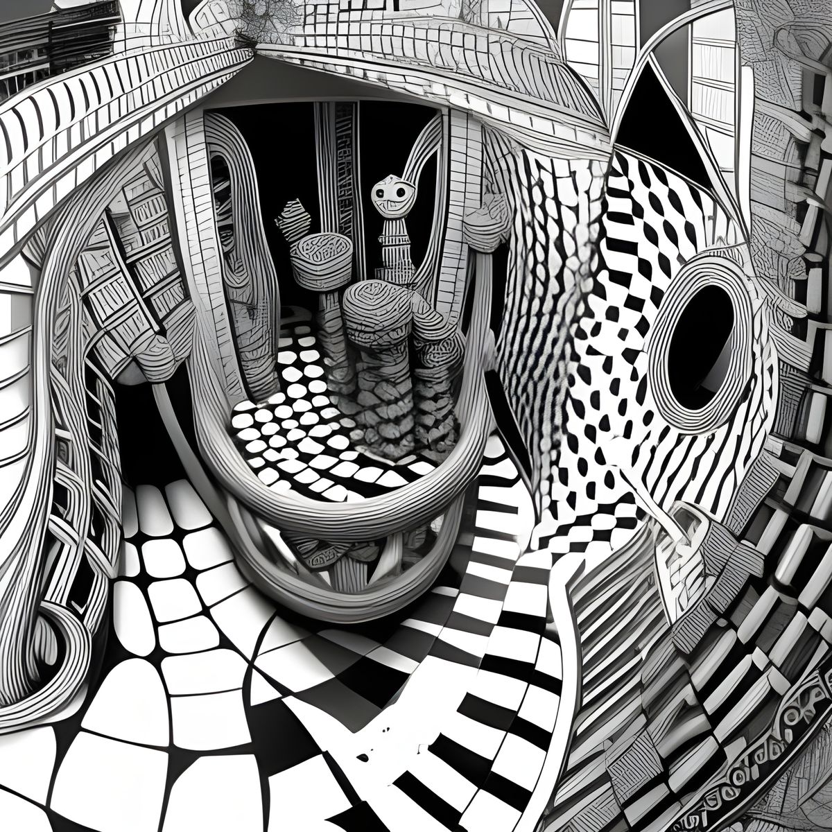 A mind-bending 3D digital art piece in monochromatic black and white, inspired by the impossible geometry of MC Escher's paradoxical stairways, rendered in stunning detail using Unreal Engine 5 and ZBrush techniques.