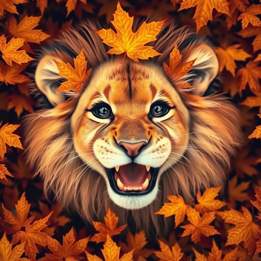 A joyful African Lion with enormous, gleaming eyes beams at the camera, nestled in a golden sea of autumn maple leaves. One crisp leaf rests playfully atop its head, matching the warm orange-brown tones surrounding it. Its mouth is open in a happy “smile”, revealing pink tongue and teeth, radiating pure delight. Soft fur, delicate whiskers, lush mane, and perked ears add to its charm. The scene evokes cozy fall vibes — whimsical, heartwarming, and perfectly capturing childhood wonder amidst nature’s seasonal beauty.