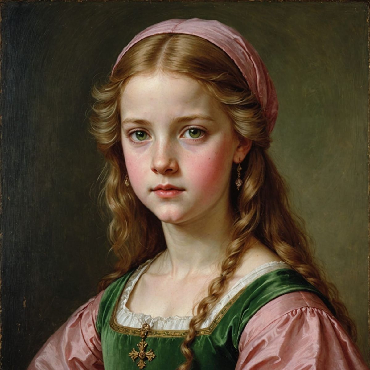 This image showcases a beautiful, detailed portrait of a medieval girl with reddish-blond hair and green eyes, wearing a pink gown. The style evokes classical Spanish painting techniques.