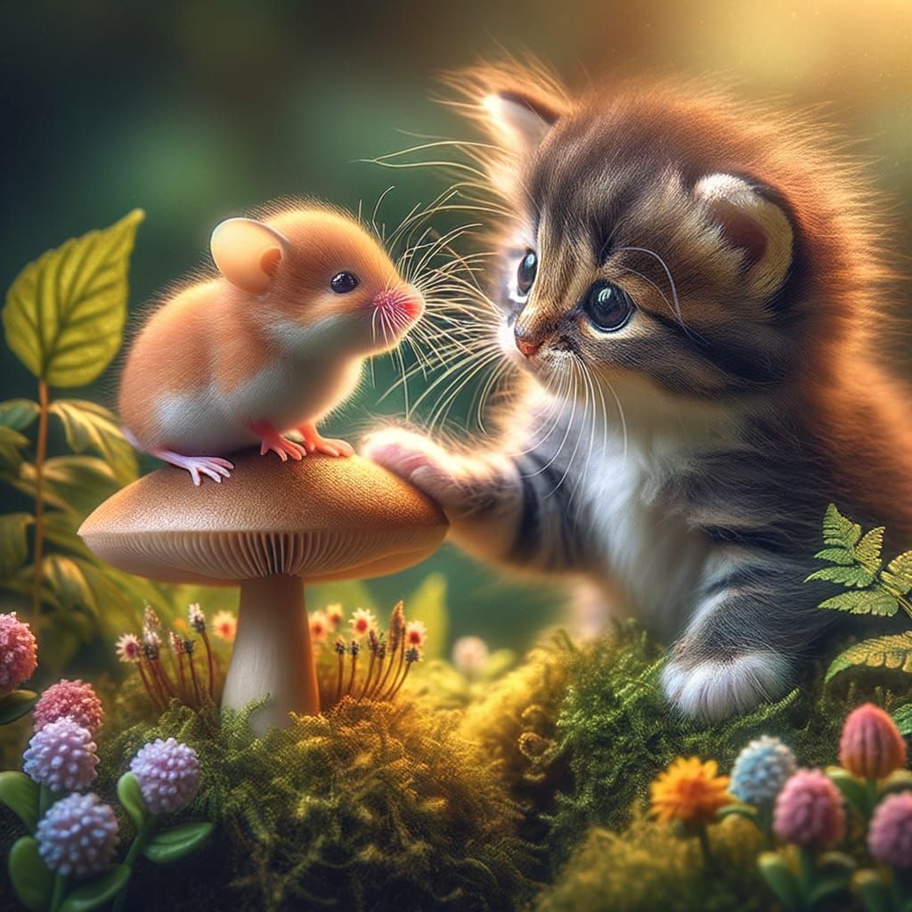 This image shows a mouse and kitten becoming friends in a miniature garden. The adorable scene captures their innocent interaction as they meet under the warm morning sun.