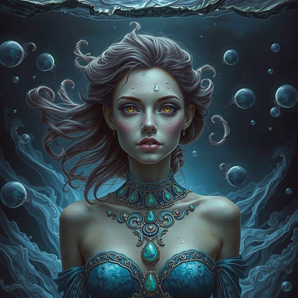 This image depicts an ethereal woman swimming through the turbulent night sea on Venus, surrounded by glowing jellyfish and illuminated by flashes of lightning, in a futuristic, neon-lit landscape with swirling patterns of liquid ink flux.