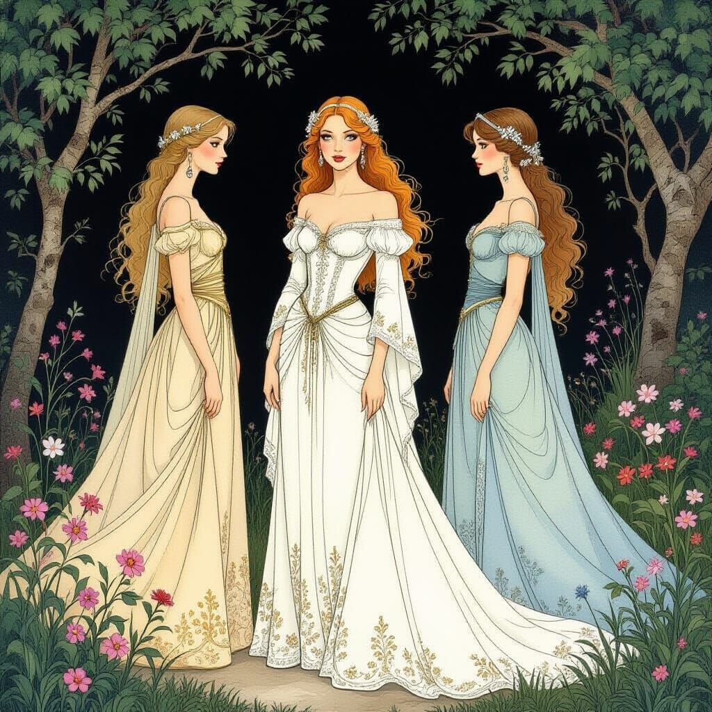 This image shows ethereal fairies adorned in sheer, flowing gowns amidst a backdrop of gentle light and verdant foliage. The artwork is reminiscent of classic fairy tale illustrations with soft brushstrokes and pastel hues.