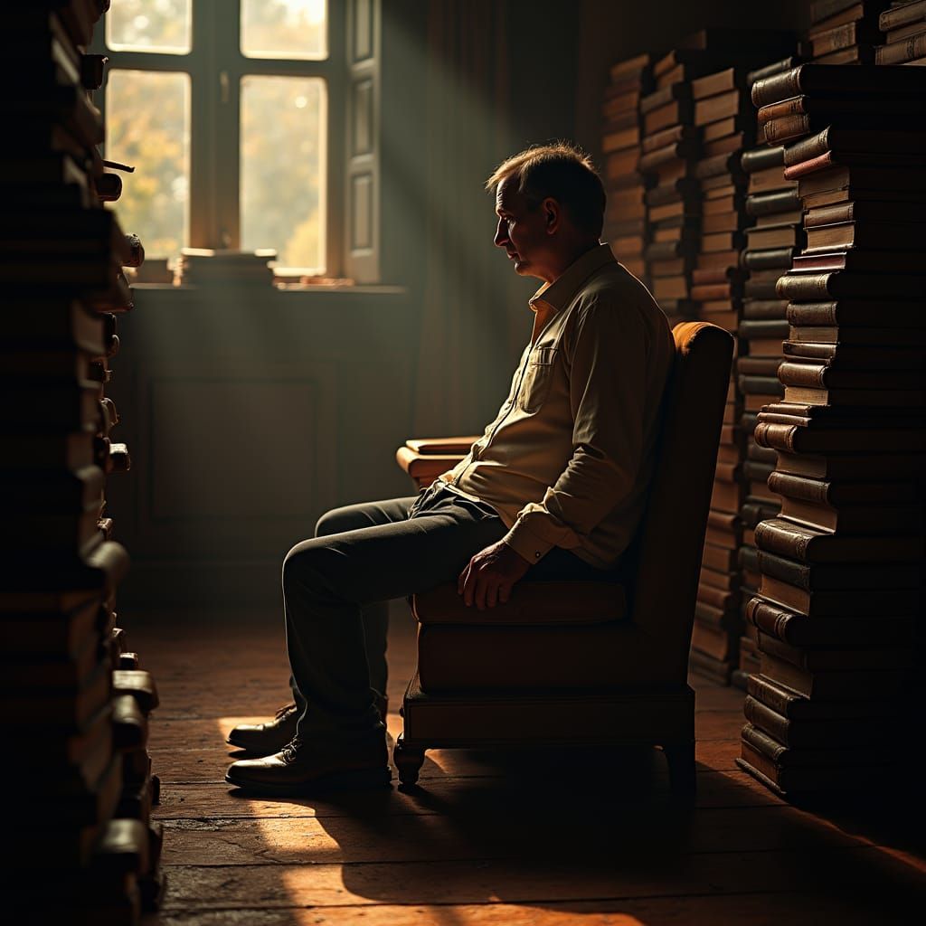 This image depicts a person sitting in a dimly lit study surrounded by vintage books, with warm golden lighting casting long shadows. The scene is reminiscent of cinematic realism and everyday life, with a focus on atmospheric detail.
