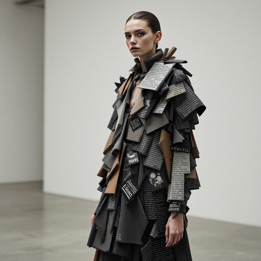 This image shows a model in avant-garde high fashion. The sculptural collage outfit features angular fabric panels with surreal text fragments, in a Dada and Cubism-inspired aesthetic.