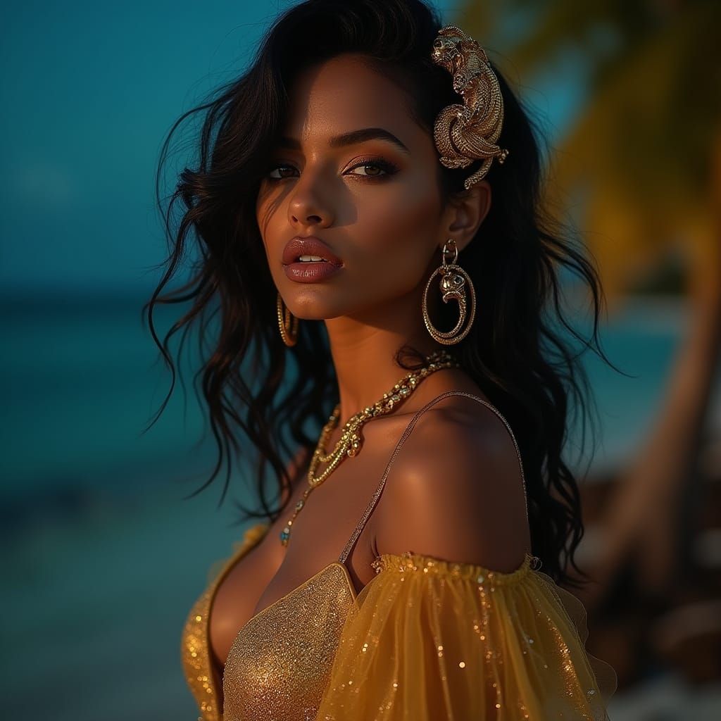 A stunning bi-racial model poses in a gold lamé Versace gown, surrounded by vibrant Florida Keys colors, with intricate details, dramatic lighting, and an air of nostalgia, blending sensual boldness and ethereal beauty in a hyper-real moonlit setting.