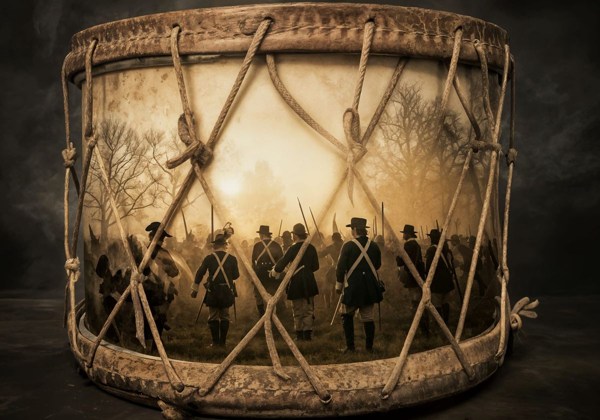 A dramatic double exposure artwork of an English Civil War snare drum. The drum's interior depicts the fierce battle between Oliver Cromwell and Charles II, rendered with stark light and shadow.