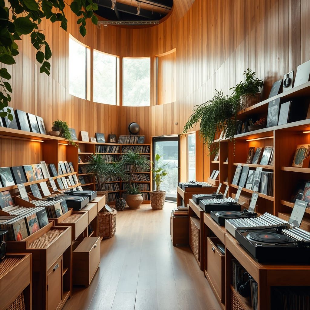 This image shows a charming record store with wooden walls, curved lines, and lush greenery, blending modern Scandinavian elements with cozy minimalism. Earthy tones and vintage decor evoke a Parisian vibe, perfect for music lovers and design enthusiasts.