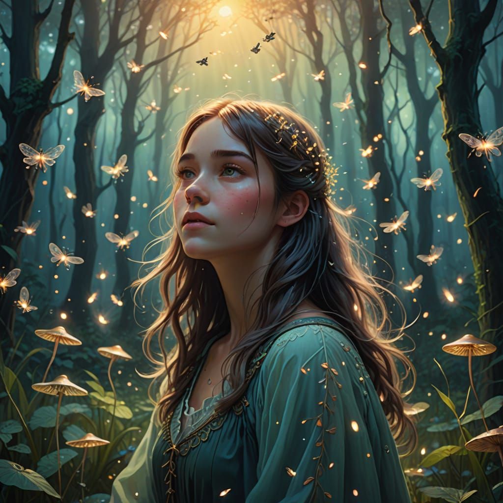 This enchanting illustration depicts a woman floating amidst a swarm of fireflies in a misty forest, surrounded by delicate, glowing mushrooms and soft pastel colors, evoking a sense of wonder and magic.