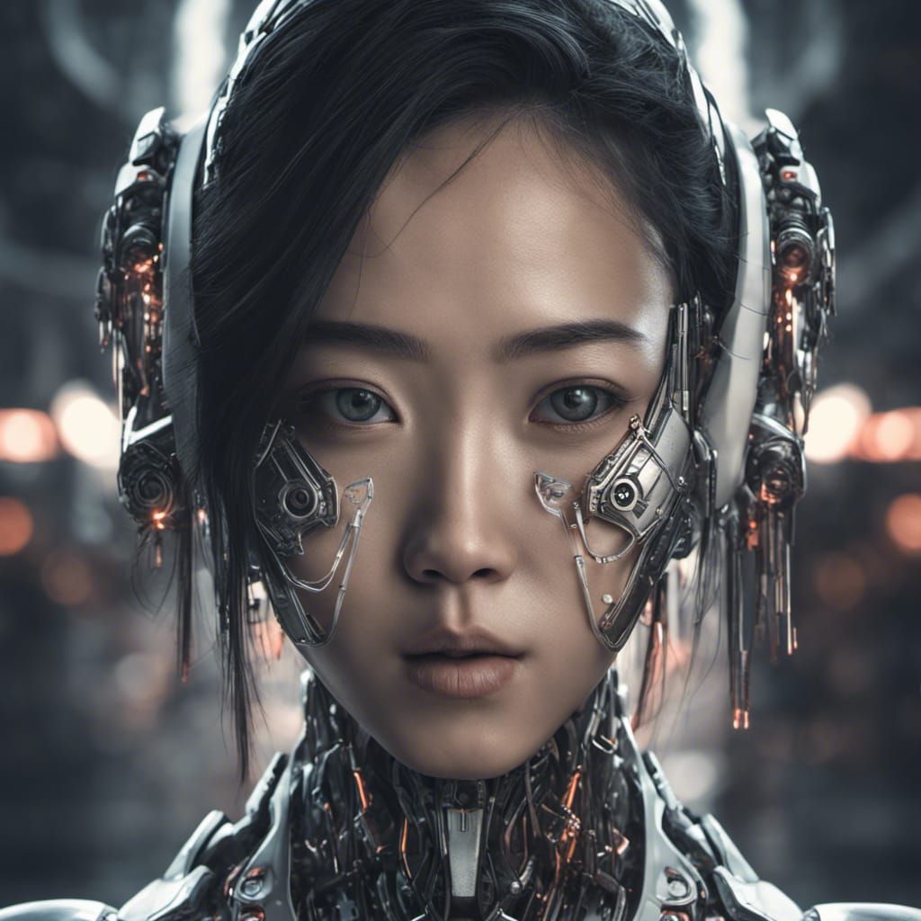 This image captures a stunning cyborg maiden with intricate details, set in a moody atmosphere with high contrast and cinematic lighting, showcasing a blend of human and robotic features in a hyperrealistic representation.