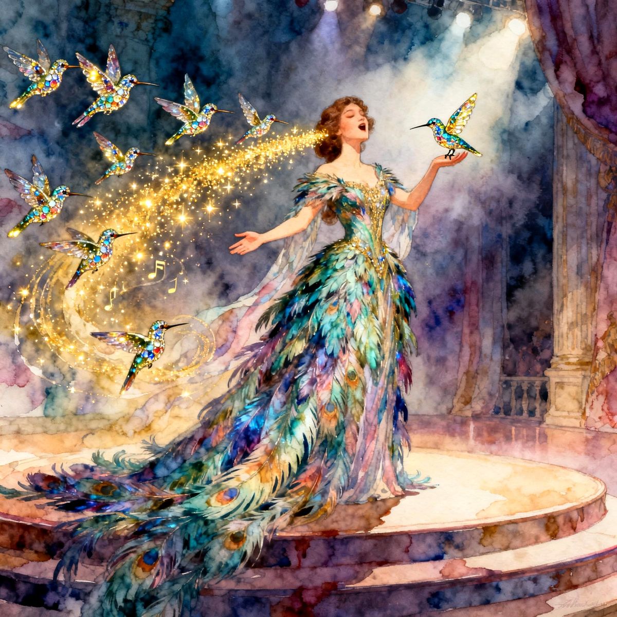 A soulful singer on stage in a shimmering feather gown, with musical notes transforming into jeweled hummingbirds. Rendered in a dreamlike watercolour concept art style with ethereal lighting.