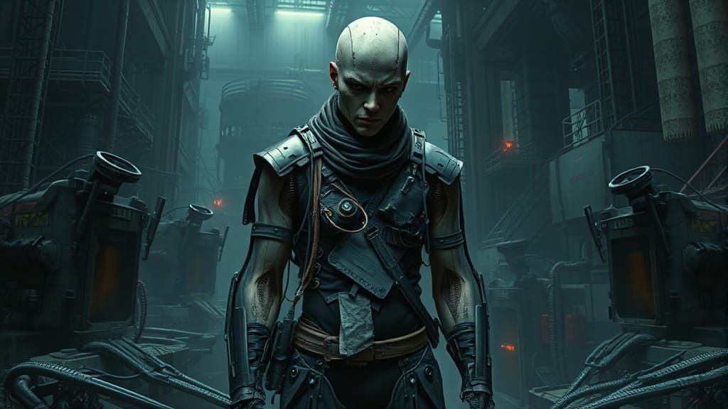This image depicts a haunting biomechanical figure in tattered cybernetic attire, set against a dark, industrial backdrop with dystopian and futuristic machinery elements.