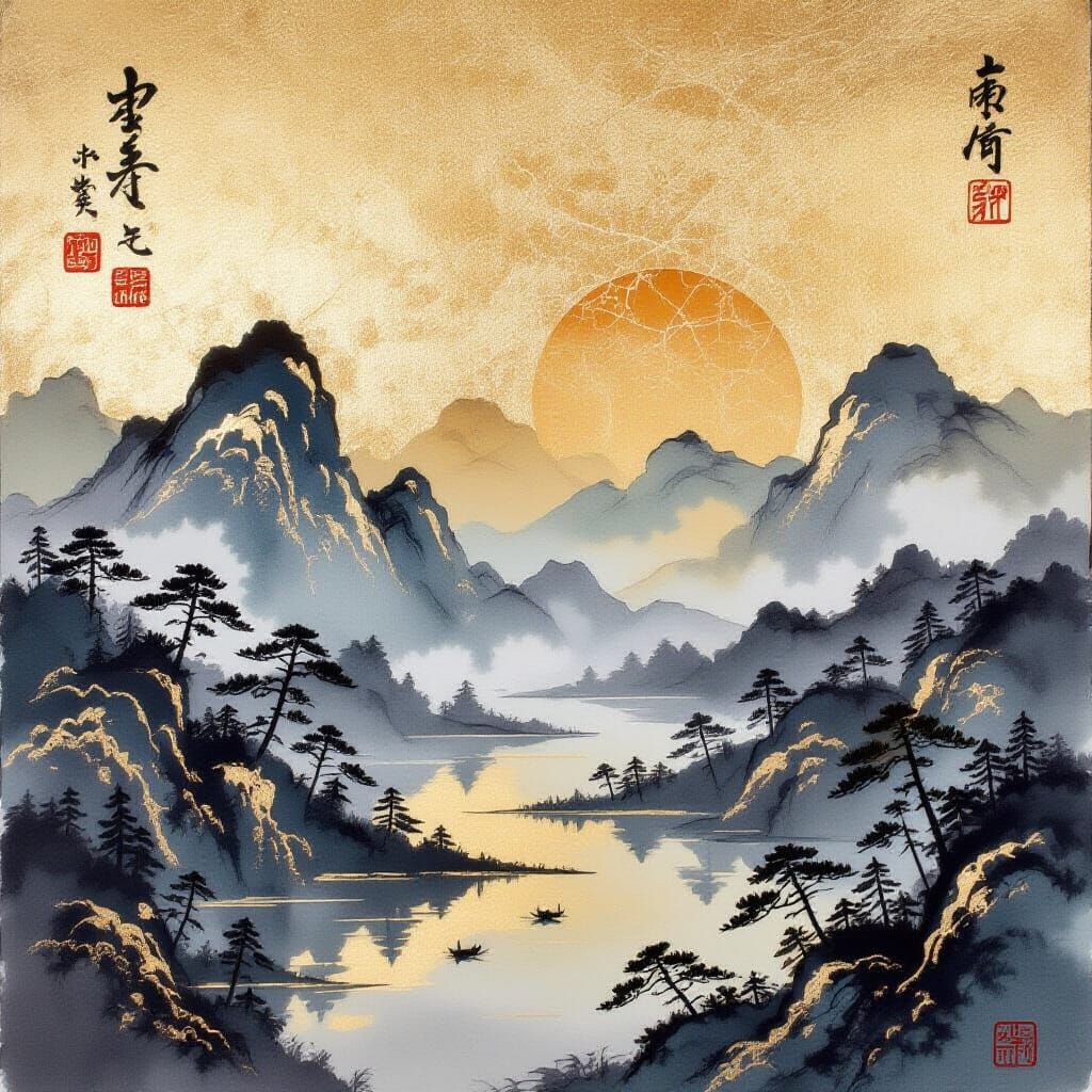 Generate your own stunning ink wash landscapes, featuring gold ink craquelure, easily and for free with our AI tool.