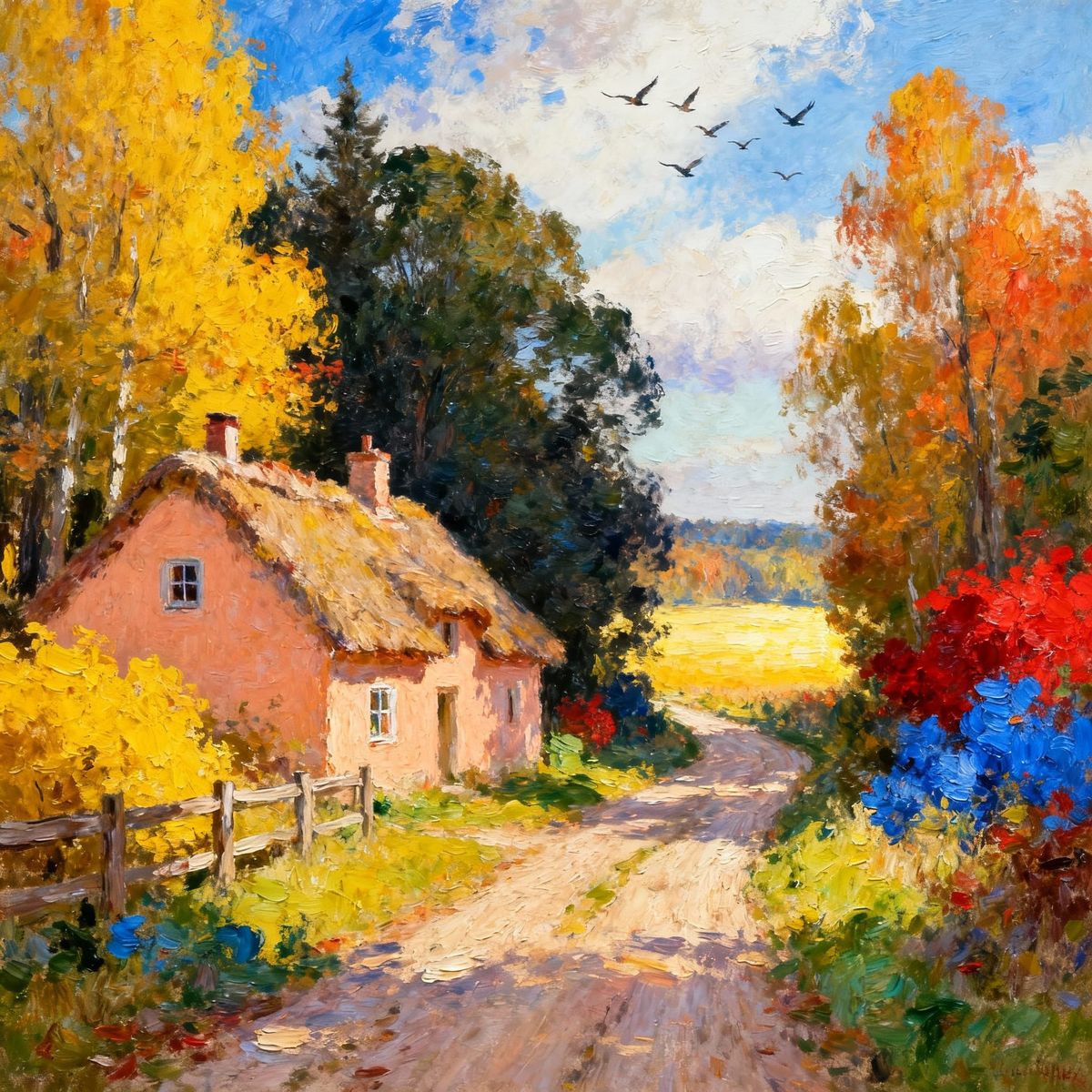 This image showcases charming peach-colored cottages in a lush forest, rendered in an impressionistic style with thick, visible brushstrokes. A dirt road winds through vibrant autumnal foliage towards a sunlit field under a soft blue sky.