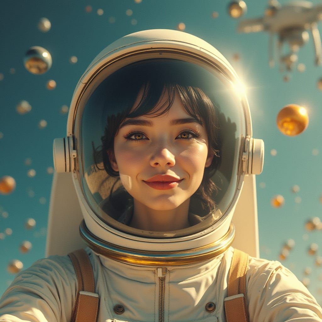Uma mulher astronauta elegante, com cabelos cacheados e uniforme espacial prateado, flutua em uma garrafa surreal tirando uma selfie, cercada por taΓ§as de ouro e prata em cima de um drone de ouro. Ao seu lado, uma engrenagem intricada gira lentamente, enquanto uma gota colorida de cristal suspensa no ...