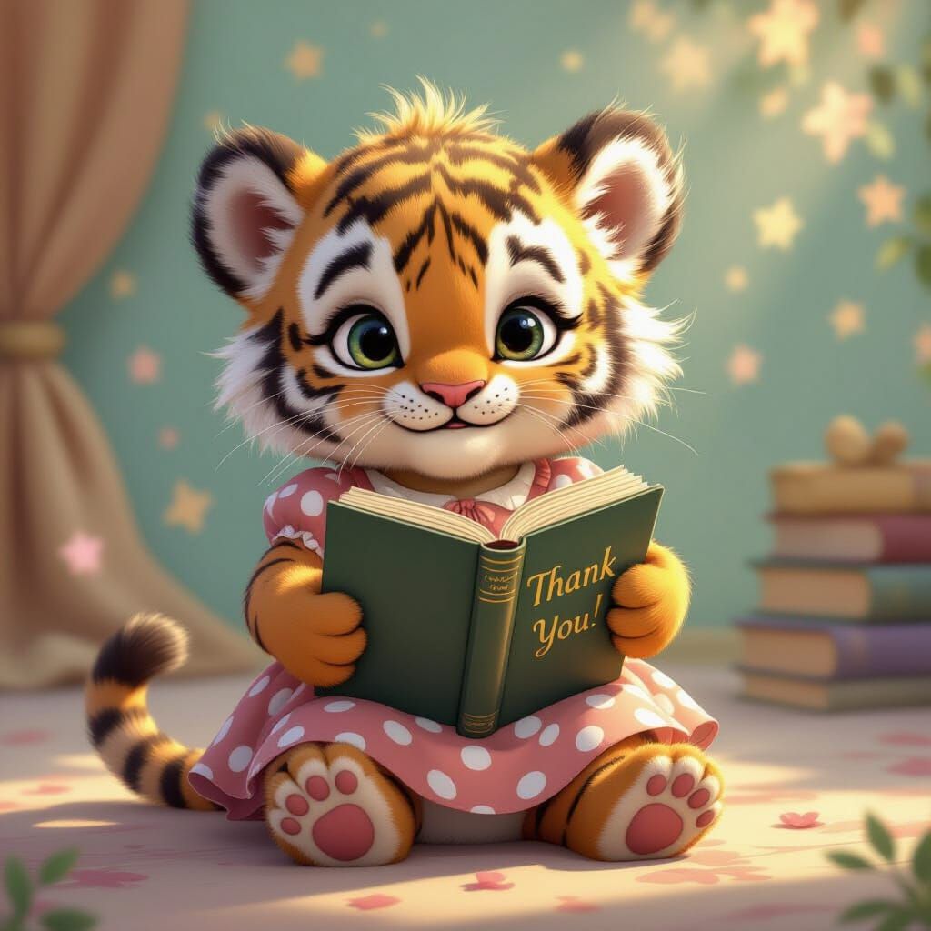 This heartwarming image shows a fluffy baby tiger in a polka dot dress, holding books. Rendered in a detailed 3D cartoon style with soft, dreamy lighting.