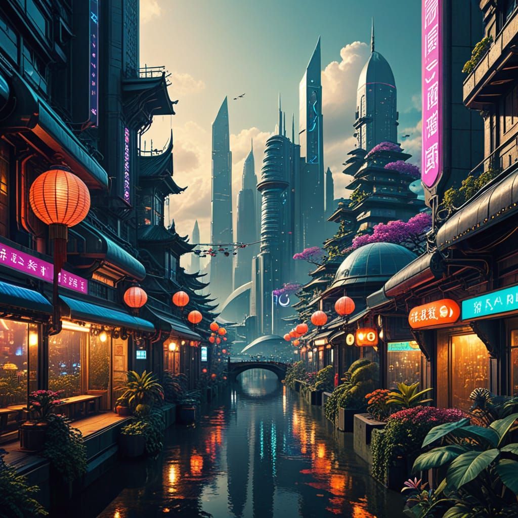 This image depicts a stunning oriental cityscape in a futuristic utopia, blending natural and floral elements with metallic and colorful technology, set against a retro-futuristic skyline with a sense of wonder and fantasy.