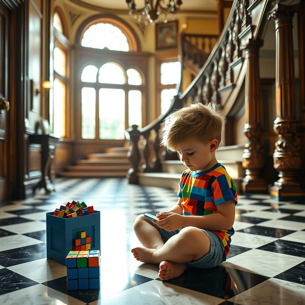 This image captures a warm, golden-lit foyer with black and white chessboard marble tiles, a grand staircase, and a boy intently focused on solving a Rubik's Cube, surrounded by colorful toys and elegant details, reminiscent of hyper-realistic paintings and master photographers.