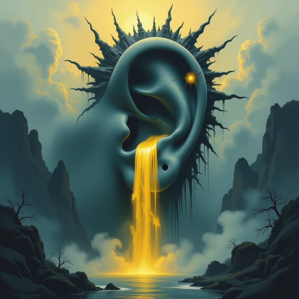 A surreal image of a human ear. A vibrant yellow waterfall dramatically flows from the ear in a style reminiscent of dark fantasy art. High contrast and intricate textures.