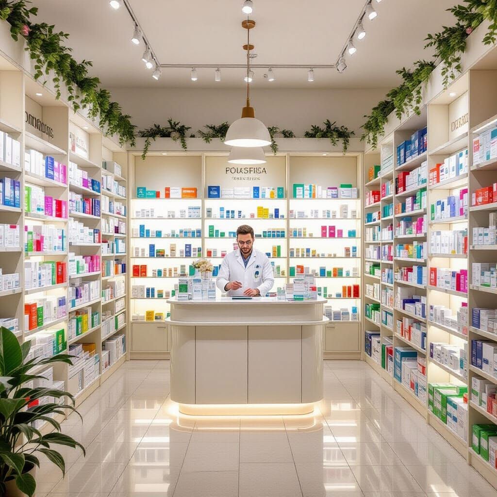 A realistic photo of a brightly lit, modern pharmacy. Shelves are neatly arranged with health products and a pharmacist stands at the counter. The image features soft, naturalistic colors.