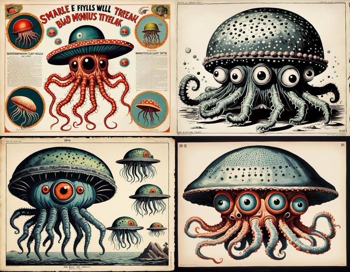 This image depicts a bizarre mutant creature resembling a polka-dotted jellyfish prawn in a sombrero, as if in a vintage 1930s movie poster. The horror-themed artwork features grotesque anatomy.