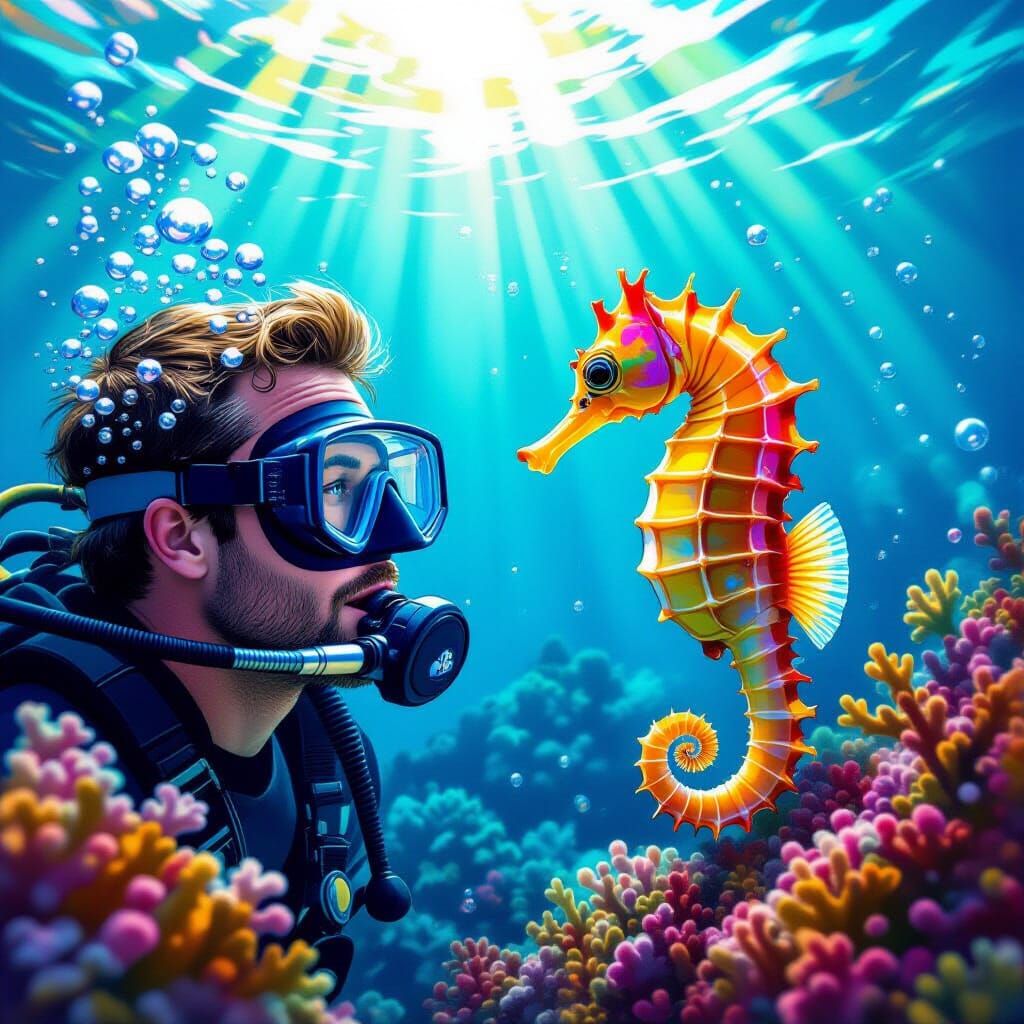 This image shows a scuba diver's close-up view of a stunning, technicolor seahorse amidst a vibrant coral reef. Shimmering light and rising bubbles create an atmospheric underwater scene, depicted in a detailed, painterly style.