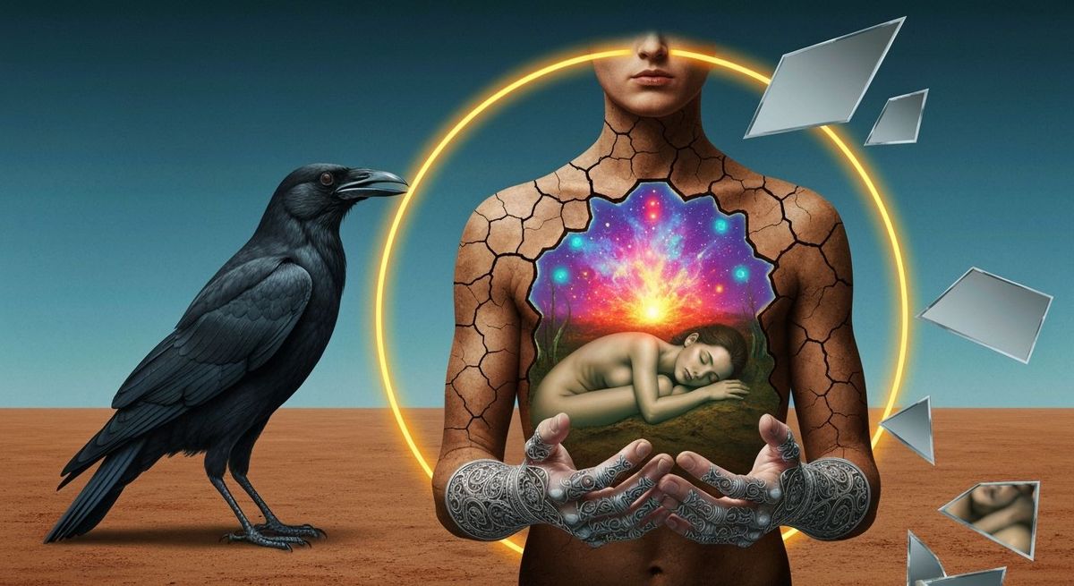 A surreal image depicts a crow leading a soul to the underworld. A figure with cracked earth skin reveals a glowing oasis, with a sleeping figure inside, rendered in vivid colors and dynamic lighting.