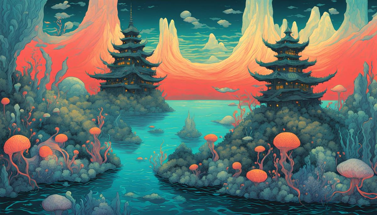 A beautiful painting of an underwater city with large creatures swimming around it. This fantasy illustration features iridescent accents, soft lighting, and delicate textures in celadon, jade and indigo.