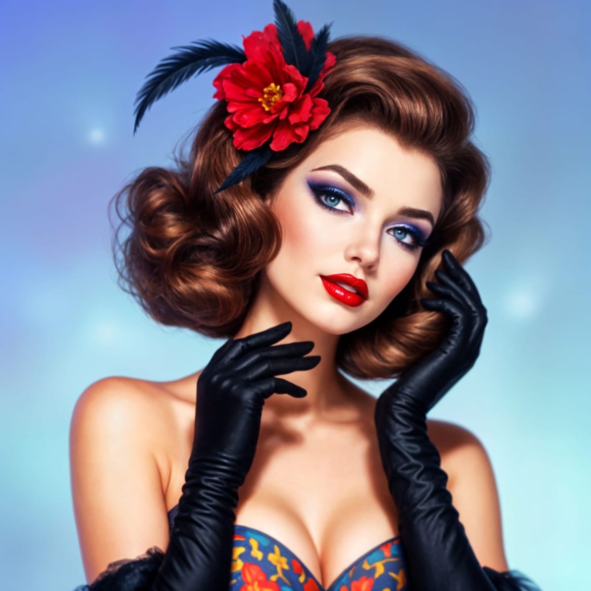 This digital painting showcases a glamorous woman with vintage Hollywood style, featuring wavy brown hair, bold makeup, and elegant attire. The soft blue background creates a dreamy atmosphere.