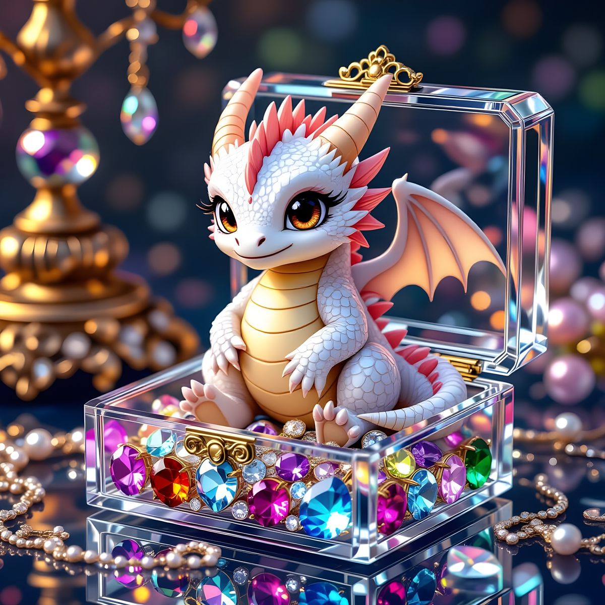This image shows a miniature white dragon inside a glass jewelry box filled with colorful glass jewelry. The dragon's scales shimmer, and its large eyes add to the magical scene in a 3D anime art style.