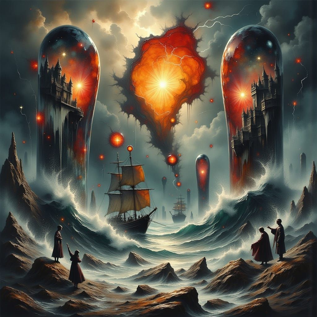 This image shows three surreal glass sculptures emerging from a stormy sea. The detailed glasswork, in black, red, and orange, features religious and peace symbols, reflecting the chaotic scene in an abstract style.