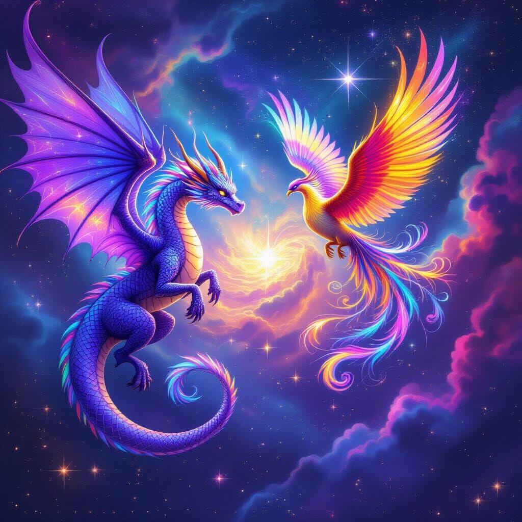 This image shows a celestial dragon and rainbow phoenix soaring through a nebula. The dragon features stardust scales, while the phoenix has cosmic fire trailing its wings, in a psychedelic fantasy art style.
