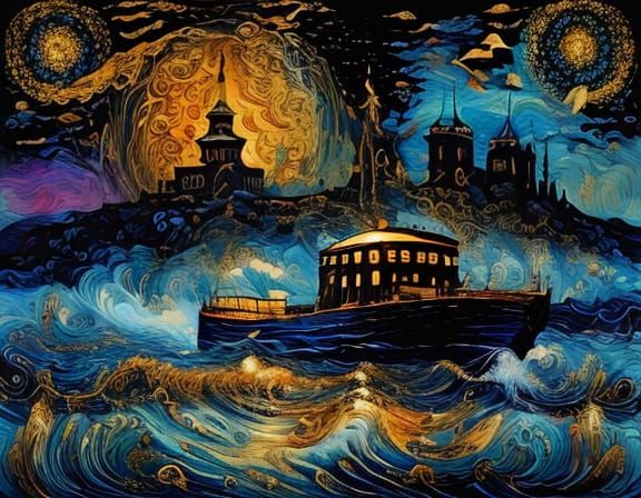 This Art Deco illustration features a swirling arabesque pattern with gilded accents in gold and deep blue. Intricate filigree details create a sense of movement and elegance on a dark background.